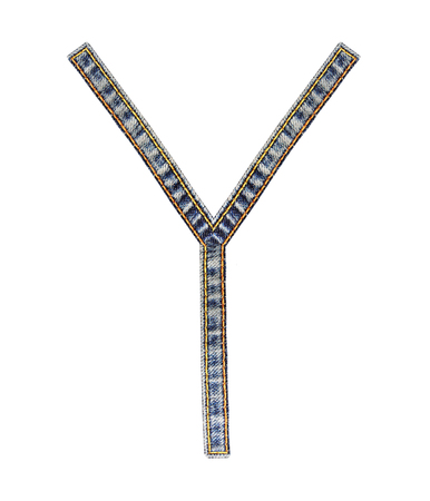 A blue letter Y is sewn onto a blue background. The letter is made of denim and has a unique, artistic appearance