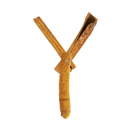 Cinnamon font. Letter Y is made from pieces of cinnamon on white isolated. Alphabet letters font set from spices