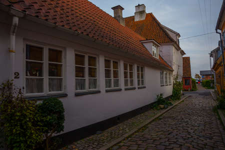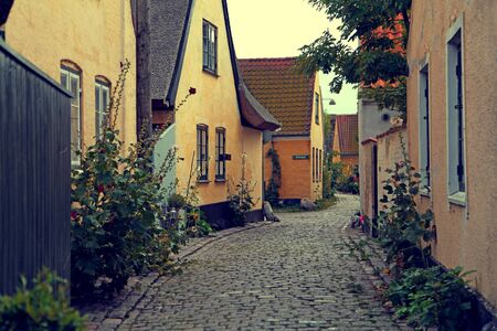 The old part of Dragoer which is a cozy, picturesque maze of alleys with yellow painted houses, red roofs, and cobblestone streets built in the traditional Danish style.