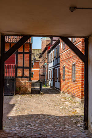 Cobblestoned alley with old crooked half-timbered houses in Lund Sweden
