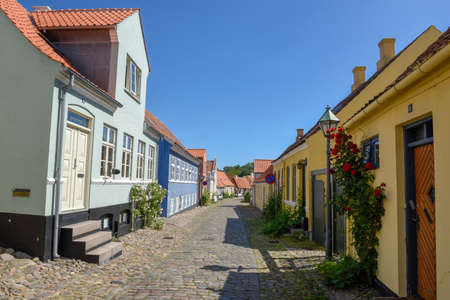 An idyllic cobbled street with colorful houses at the old town of Aalborg, Denmark