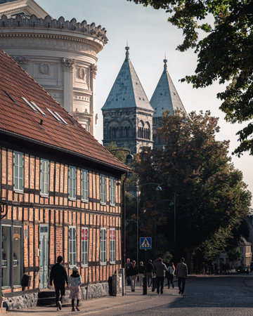 Lund, Sweden - September 19, 2020: People are walking down cobblestoned street bordered with historic buildings such as Lund cathedral
