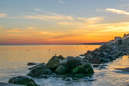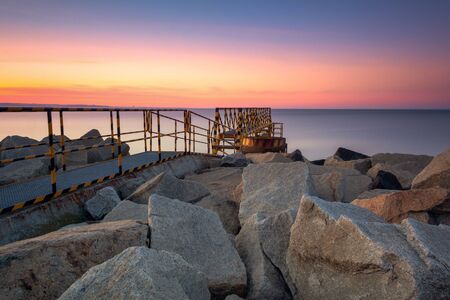 A rocky breakwater overlooking the gulf of Gdansk near the beach at Westerplatte at sunset. Gdansk, Poland