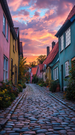 A charming cobblestone street meanders through a picturesque village, flanked by vibrant houses as the sky transitions to warm hues during sunset. This enchanting location invites exploration.