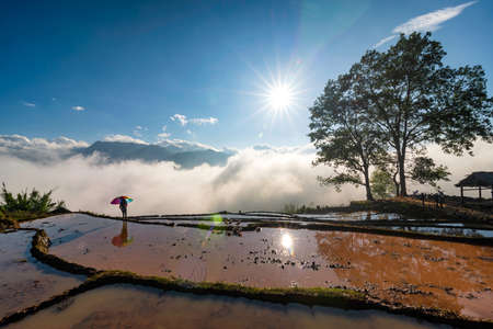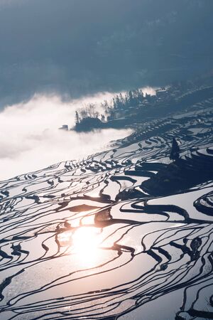 Scenery of rice terraces in Yunnan province of China and local peasant walking at morning sunrise