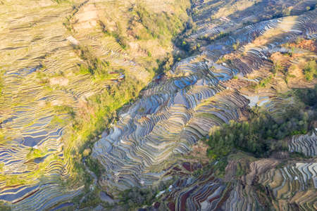 aerial view of beautiful terraced field landscape in sunset, yuanyang county, yunnan province, China