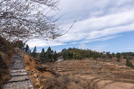 Terraced rice field landscape with road and big tree in Choan Then, Y Ty, Bat Xat