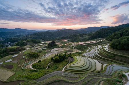 Aerial view of sunset over rice terraces