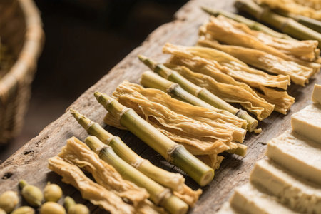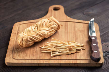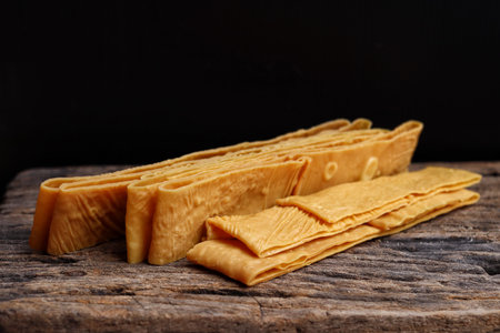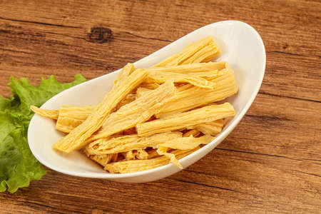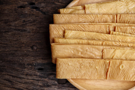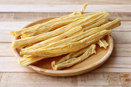 Soy bean curd sticks on wood background