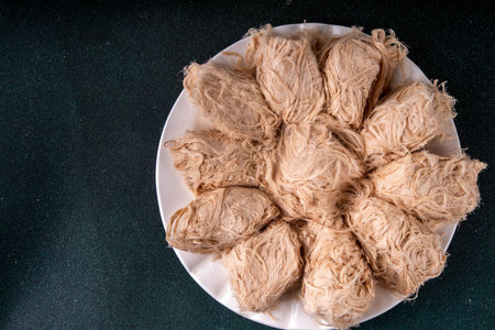 Traditional Asian sweets Pishmaniye, also known as Pashmak, Dragon's Beard, or Kkul Tarae, thread-like hair halvah, with nutty flavor, on a plate, copy space