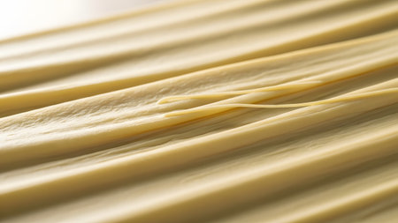 A close-up texture shot of raw, flat pasta strands, possibly fettuccine or homemade dough. The smooth, flour-dusted surface and linear arrangement create a neutral food background representing italian cuisine and culinary preparation.