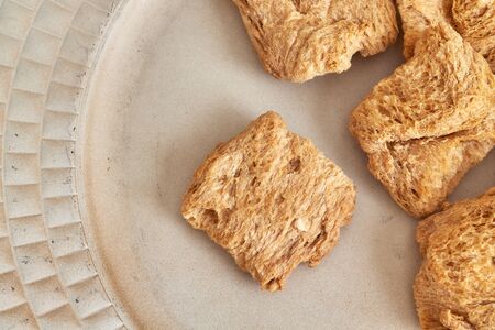 Raw dehydrated soy meat on white rustic plate. Top view with copy space