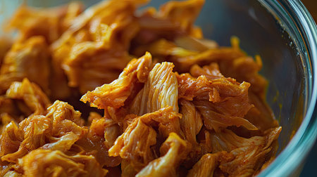 A close-up image of a delicious shredded spicy vegetable mixture in a transparent glass bowl. Ideal for culinary presentations and food photography.