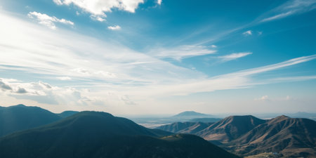 Stunning view of a mountainous landscape featuring lush green hills fading into a misty blue atmosphere under a beautiful cloudy sky, perfect for nature enthusiasts.