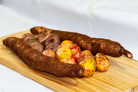 Raw yucca on the wooden table, Manihot esculenta. (Cassava raw tuber) with regional potatoes from the Andes at a market in Peru, Bolivia, Argentina, south america.