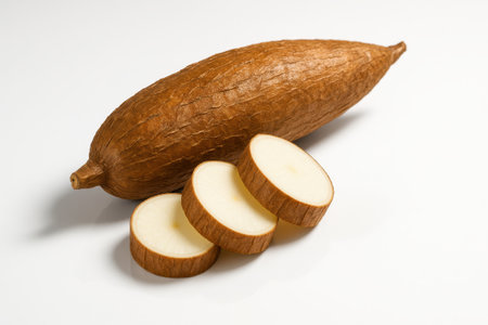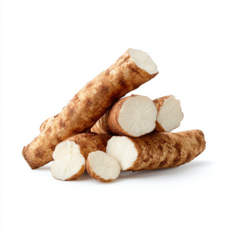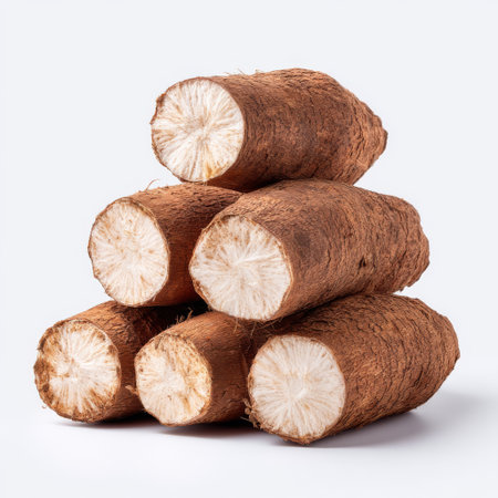 Fresh cassava roots stacked artfully against a clean white background, showcasing their earthy texture and natural form, perfect for culinary and dietary uses.