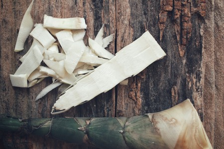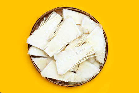 Sliced raw bamboo shoots in bamboo basket on yellow background.