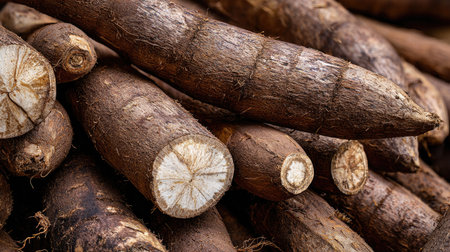 A visually appealing stack of fresh cassava roots showcasing their earthy texture. Perfect for healthy cooking and promoting natural food ingredients.