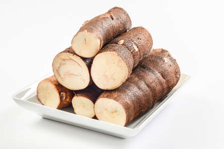 Organic raw Cassava or manioc tuber on white background. Yucca cassava root. Popular Indonesian and local food. Close up.