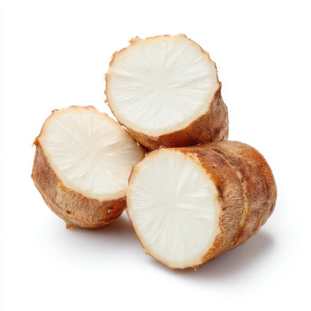 The image showcases fresh cassava roots sliced in half, revealing the white interior. Perfect for highlighting healthy eating and natural ingredients.