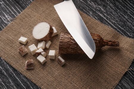 Sliced yucca root on a sackcloth on a black wooden table with a knife. Tropical food ingredients