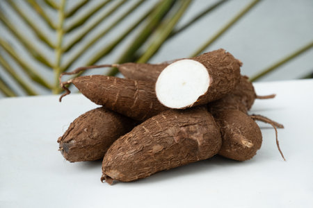 Cassava roots are arranged thoughtfully on a white background, emphasizing their unique texture and shape. The earthy tones stand out in natural light, highlighting their natural beauty.