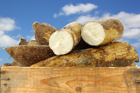 cassava root and some pieces in a wooden crate against a blue sky with clouds