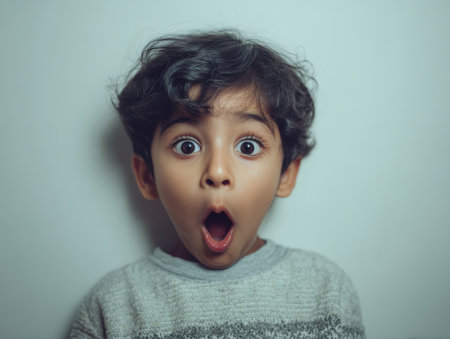 Young child with curly hair displays a wide-eyed, surprised expression, mouth open in shock, wearing a light gray sweater. The background is simple, enhancing the child's expression