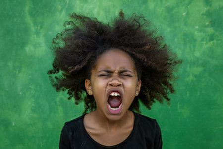 Portrait of a young african american woman screaming against green background