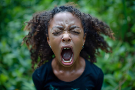 Portrait of a young beautiful african american woman screaming in the jungle