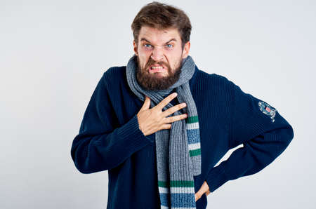 Man with a beard on a light background in a scarf and a sweater, flu, sickness, sick.