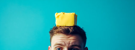 Man balancing butter on head, health, humor, and dairy delight