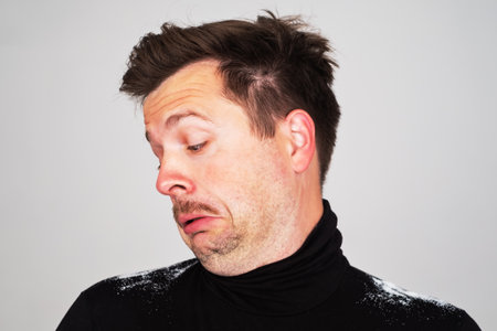 Worried guy looking at his shoulder movina away the dandruff