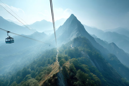 Cable way vanishing in mist in Tianmen Mountain, Zhangjiajie, Hunan, China