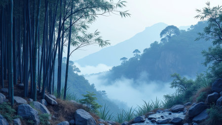 Early morning breeze rustling through a valley of Chinese mountains, with birds emerging from misty trees