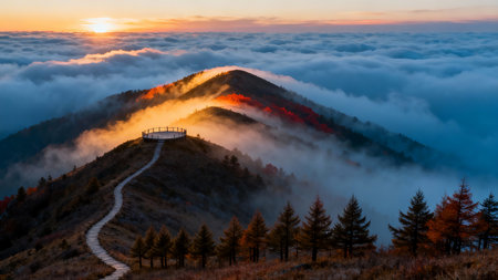 Sunrise on the top of the mountain with a wooden path in the clouds