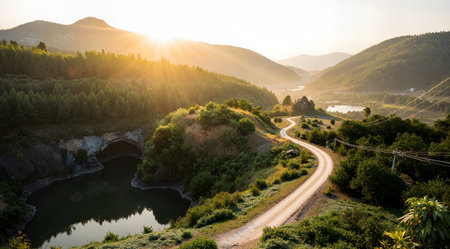 A breathtaking view of mountains during dawn, with fog enveloping the hills and wind turbines dotting the landscape, capturing the essence of nature's tranquility.