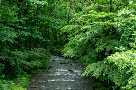Oirase Stream in sunny day, Flowing river, green leaves, mossy rocks in Towada Hachimantai National Park, Aomori, Japan.
