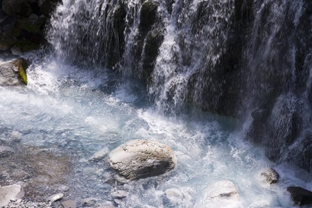 Beautiful scenery of Shiraito Waterfall in Karuizawa, Japan. The site is most beautiful in the fall, when the leaves change color creating a heavenly scene.