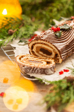 Bush de Noel Christmas Log Cake and New Year background. Copy space.