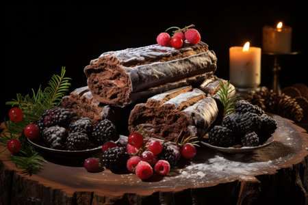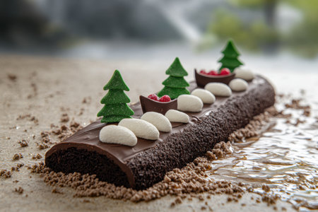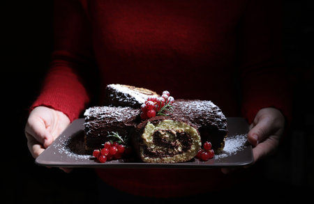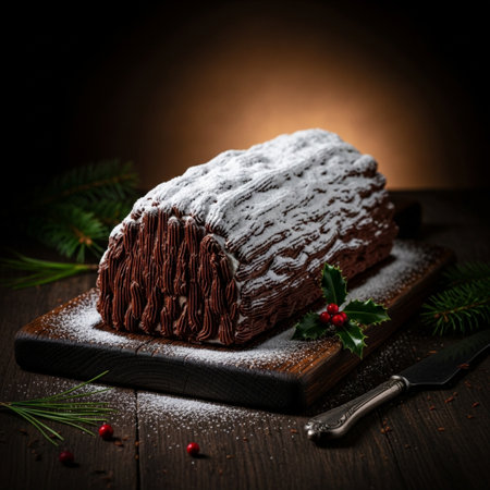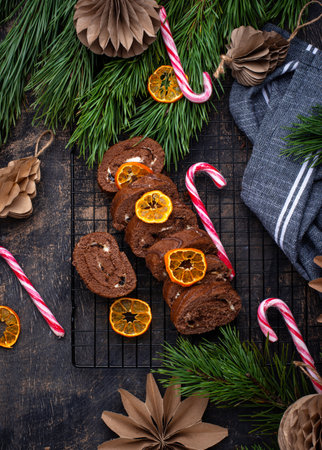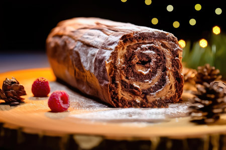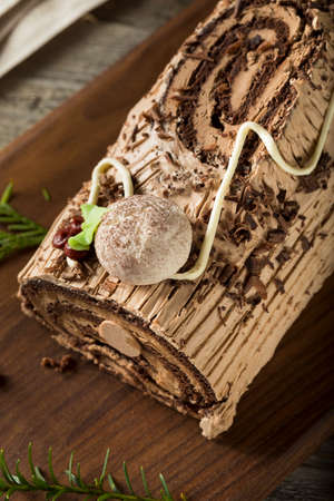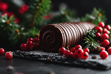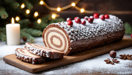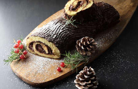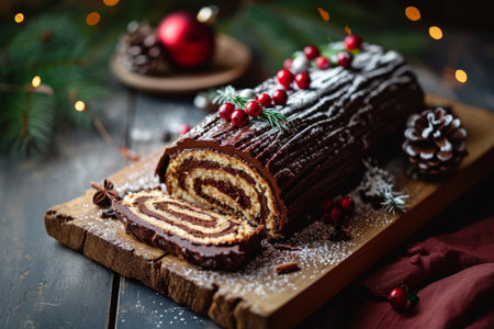 Delicious chocolate yule log cake celebrating christmas and new years eve