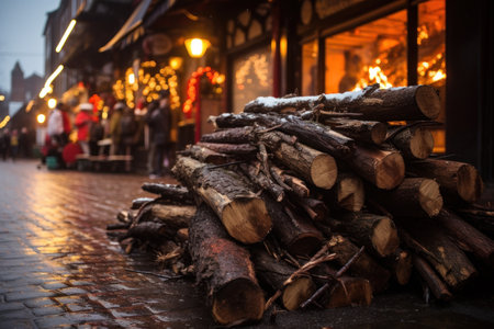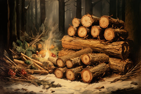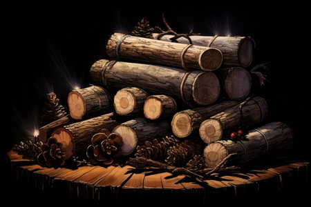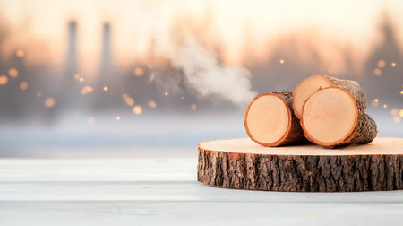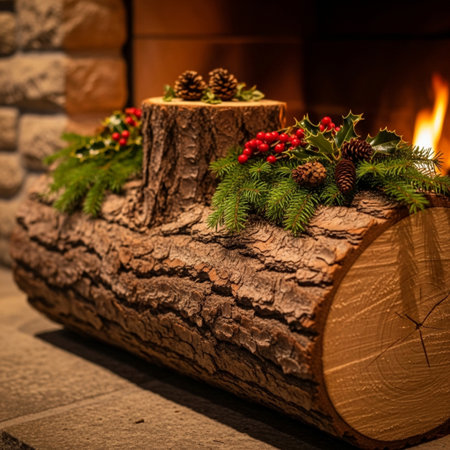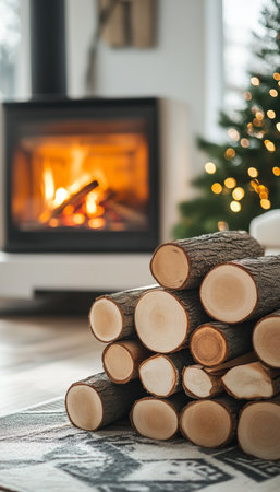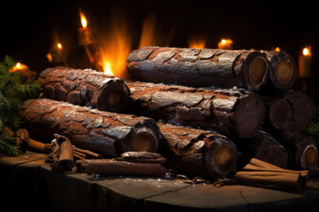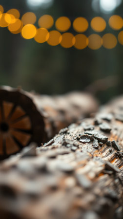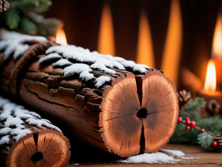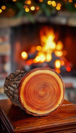 A detailed view of a newly sawn wooden log, with warm fireplace flames and soft glowing lights creating a cozy, inviting atmosphere.