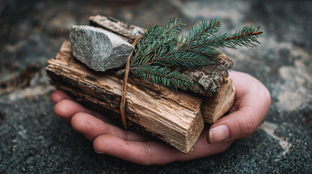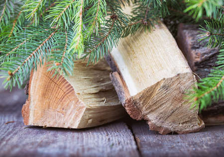 Hand holding a stack of firewood with spruce branch on the background.