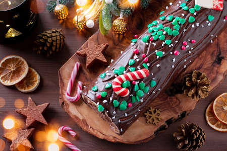 Traditional Christmas cake, chocolate Yule log with festive decorations