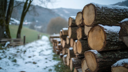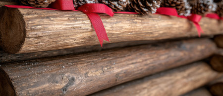 Wooden logs close-up with bark lying horizontally on each other, they are covered with frost and have a rough texture brown color, as a textured background for a template or banner