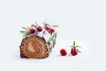 Chocolate Christmas Yule Log, Buche de Noel on white background. Christmas decorations