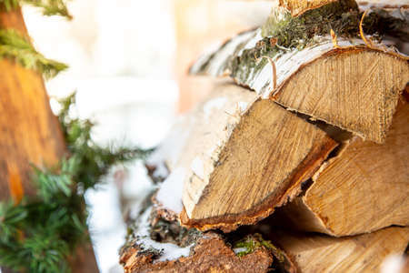 Stack of chopped pile firewood in snow Preparation of firewood for the winter.
