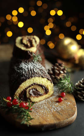 Chocolate Christmas Yule Log, Buche de Noel on wooden cutting board. Christmas decoration on dark background. Closeup