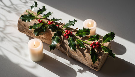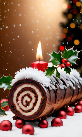 Traditional Christmas yule log cake decorated with holly, candles, and festive ornaments.. AI generated. Vector icon