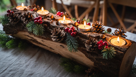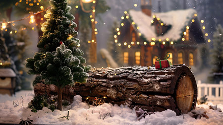 Christmas Decor. Log with fir at the wooden table